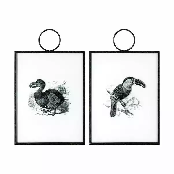 Perfect for nature lovers or those who love extraordinary designs in the house, this spectacular set of 2 hanging wall art pieces feature an engraved design of exotic birds, encased in glass and each finished with a black decorative hanging point to add further awe to the design.