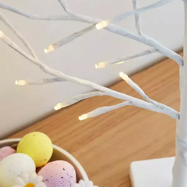 Dress up your tables this Easter with this serene white 2ft twig tree with 51 warm white LEDs. Branches are wrapped and are wipe clean. Just purchase 3 x AA batteries (NOT included) alongside the tree and light up your rooms!