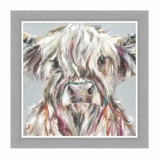 Display this stunning textured print in your home for a detailed, wildlife inspired piece of artwork with a modern touch. Featuring a colourful highland cow with multicoloured accents, this artwork offers vibrancy as well as a subtle contemporary feel with a cool grey frame.