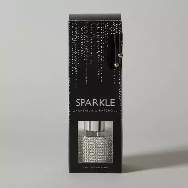 Featuring a silver diamante glass bottle, this diffuser would be the ultimate glam addition to your home. Infused with a beautiful scent of grapefruit and patchouli, this diffuser comes with black reeds with silver beads for extra decoration.