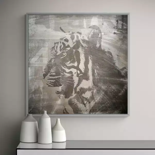 Display this magnificent tiger print in your home for a hint of wildness and intensity. This artwork illustrates a line drawing style technique to create a detailed monochrome canvas print in a square format and with a subtle silver frame to bring a contemporary touch to your home.