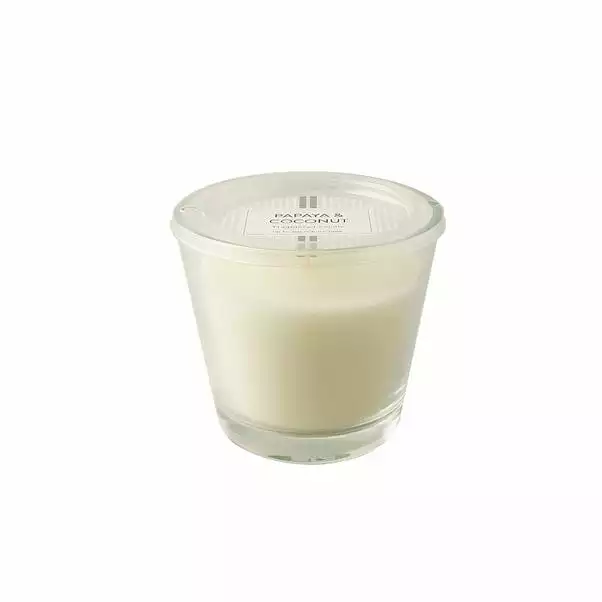Finished in a clear glass with a sealed lid, this scented candle offers a Papaya and Coconut fragrance when lit.