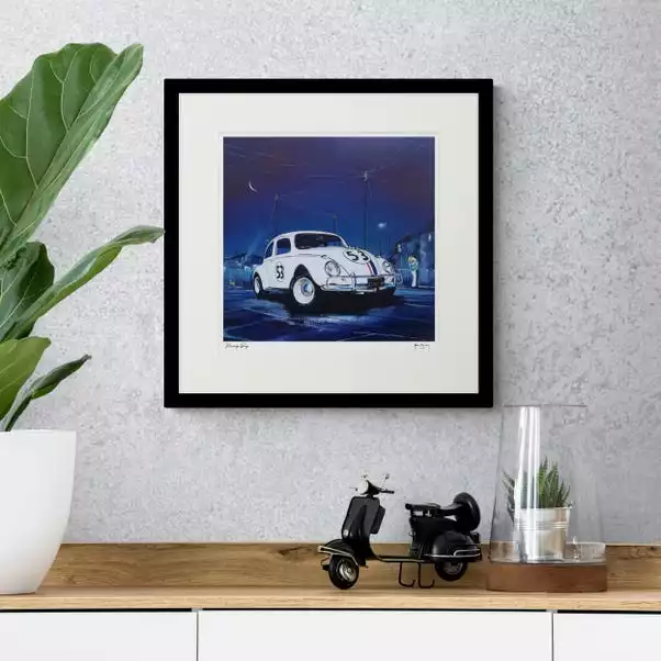 Add a nostalgic feel to your space with this artwork by Adam Barsby. Displayed in a compact square format, this piece is perfect for a car fanatic or just to add a little reminder of a classic Beetle car. To showcase the beauty of this car, the artwork is mostly set in a midnight scene with the gleaming white car at the forefront for an eye-catching look.
