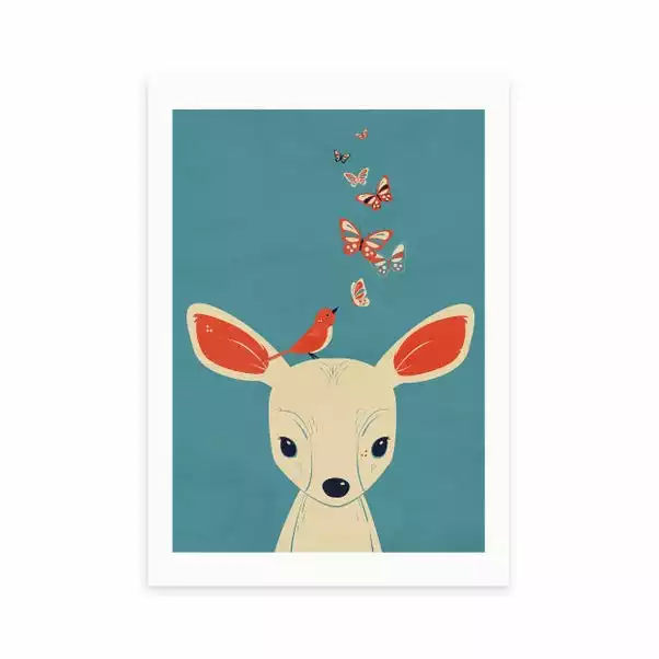Bring your little one into the world with style and the adorable designs of this artwork by Jay Fleck featuring a cute deer and sweet butterflies illustration. Perfect for adding to a nursery or bedroom, this print is made to last as it uses a Giclee printing process to stay vibrant and prevent fading over years. Each design is available in four print sizes and a variety of frame options, including unframed, so you can display your artwork however you wish.