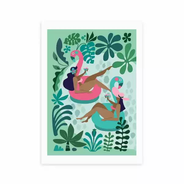 Enjoy pool party fun all year round with this bright and playful illustrative print, featuring two bronzed girls in a pool, on inflatables and captured amongst pretty floral shapes. Made using a Giclee printing process to prevent fading, this wonderful print will stay vibrant for years to come. Each design is available in four print sizes and a variety of frame options, including unframed, so you can display your artwork however you wish.