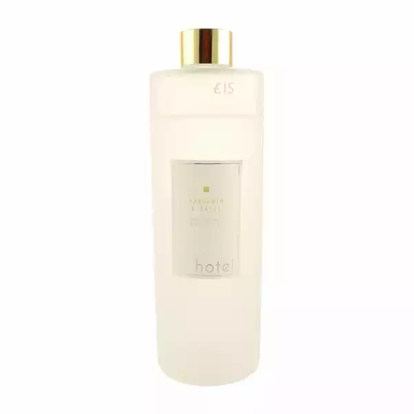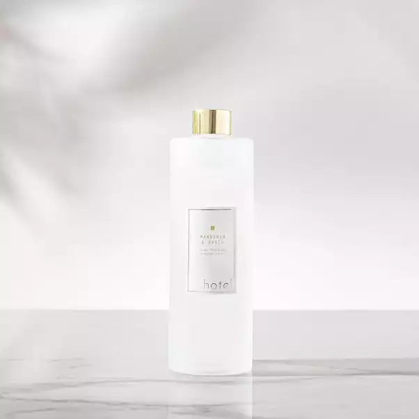 Like a cool tropical breeze, float away with notes of mandarin, basil and lime that dance beautifully with jasmine, patchouli and cedar on the base. Perfect for creating a beautiful aroma within your home. The refill with last up to 26 weeks and refills the Hotel Mandarin and Basil Diffuser twice (available to buy separately. Each refill comes in a frosted glass vessel with a matte gold effect trim.