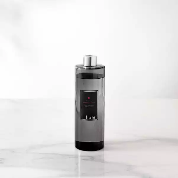 A dark and opulent pomegranate scent sparkling with juicy red fruit, pink pepper and fig, finished with a rich blend of cedarwood, musk and silky vanilla. The refill with last up to 26 weeks and refills the Hotel Pomegranate Diffuser twice (available to buy separately. Each refill comes in a translucent black vessel with a matte silver effect trim.