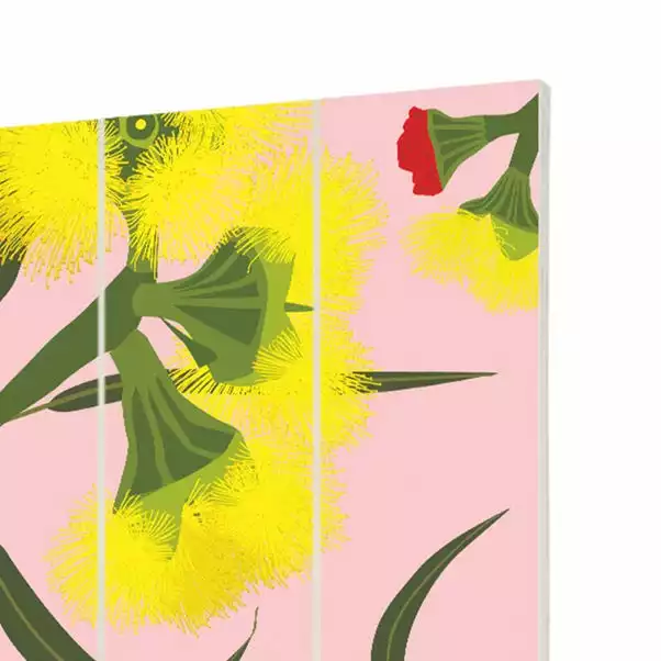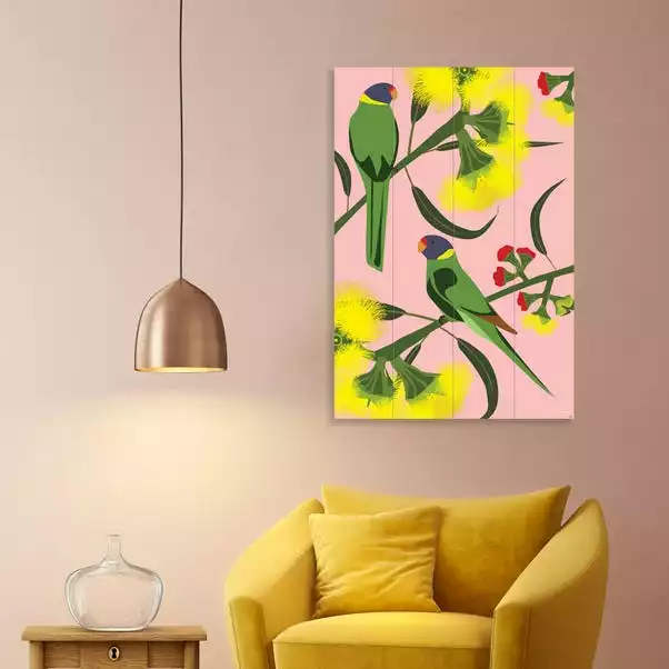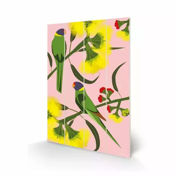 A bright array of florals and ringneck birds sit upon a wooden canvas, perfect for adding a splash of colour onto your walls.