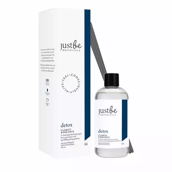 Top up on this cleansing fragrance dispersing around your home with this reed diffuser refill bottle in the fragrance “detox”. Part of the JustBe Botanicals range, these products have been developed to restore emotional balance and create a sense of wellbeing through the use of natural and essential oils as the blended tones of juniper berry brings purification, geranium stimulates emotional balance and pink grapefruit creates integrity. Designed to be used with the “detox” reed diffuser, this scent is also available in a wax candle for a complete gifting collection.